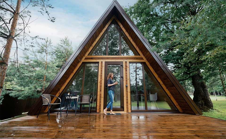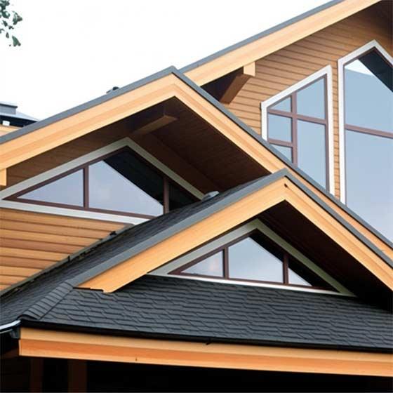 Стильные треугольные окна устанавливают под крышей. Нестандартная конфигурация, смонтированная в мансардной части дома гармонично дополняет свод двускатной или ломаной крыши. Это же креативный элемент естественного освещения.